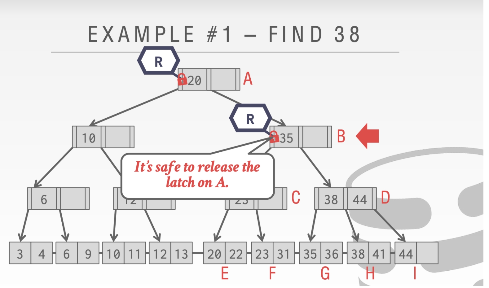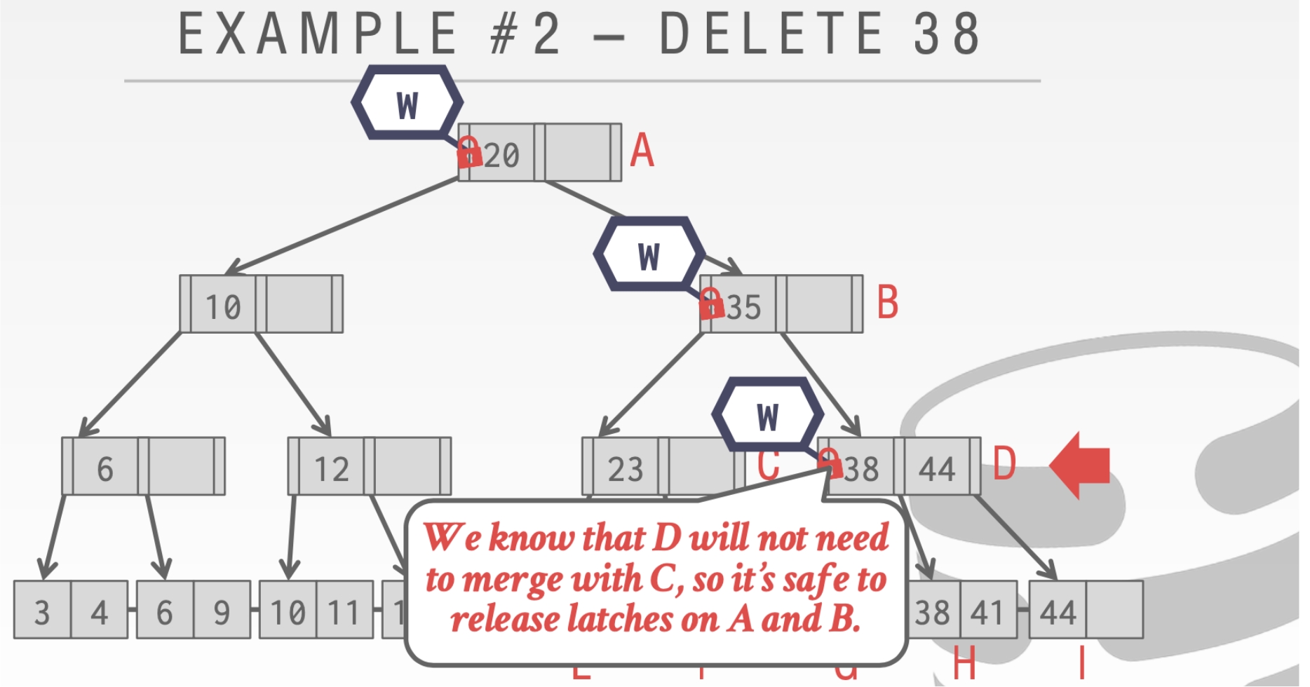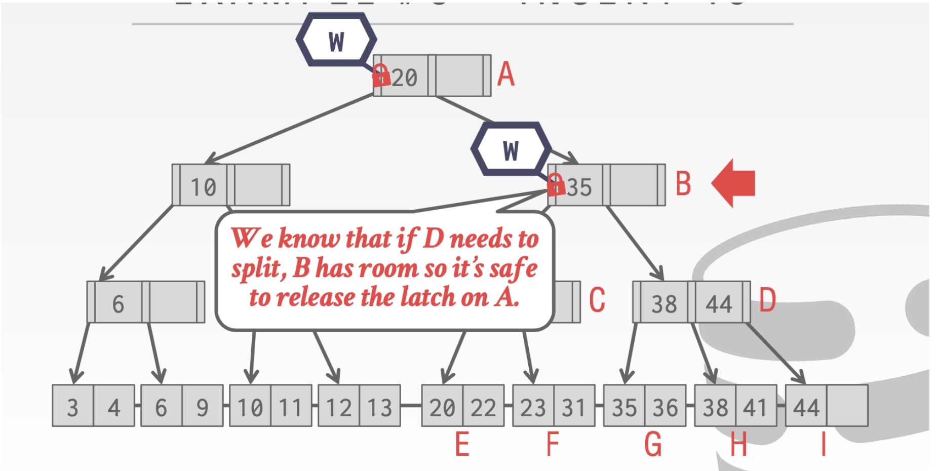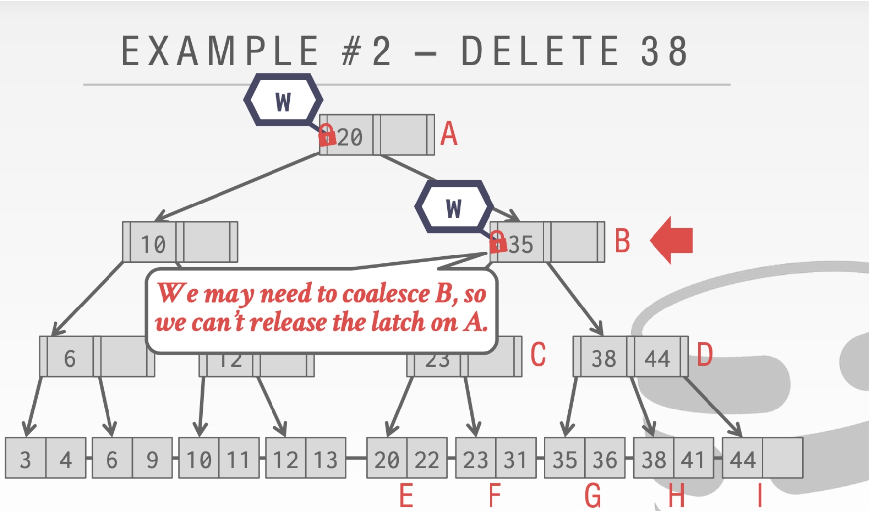 这里我们不能释放结点A的Latch。因为我们的删除操作可能会合并根节点。