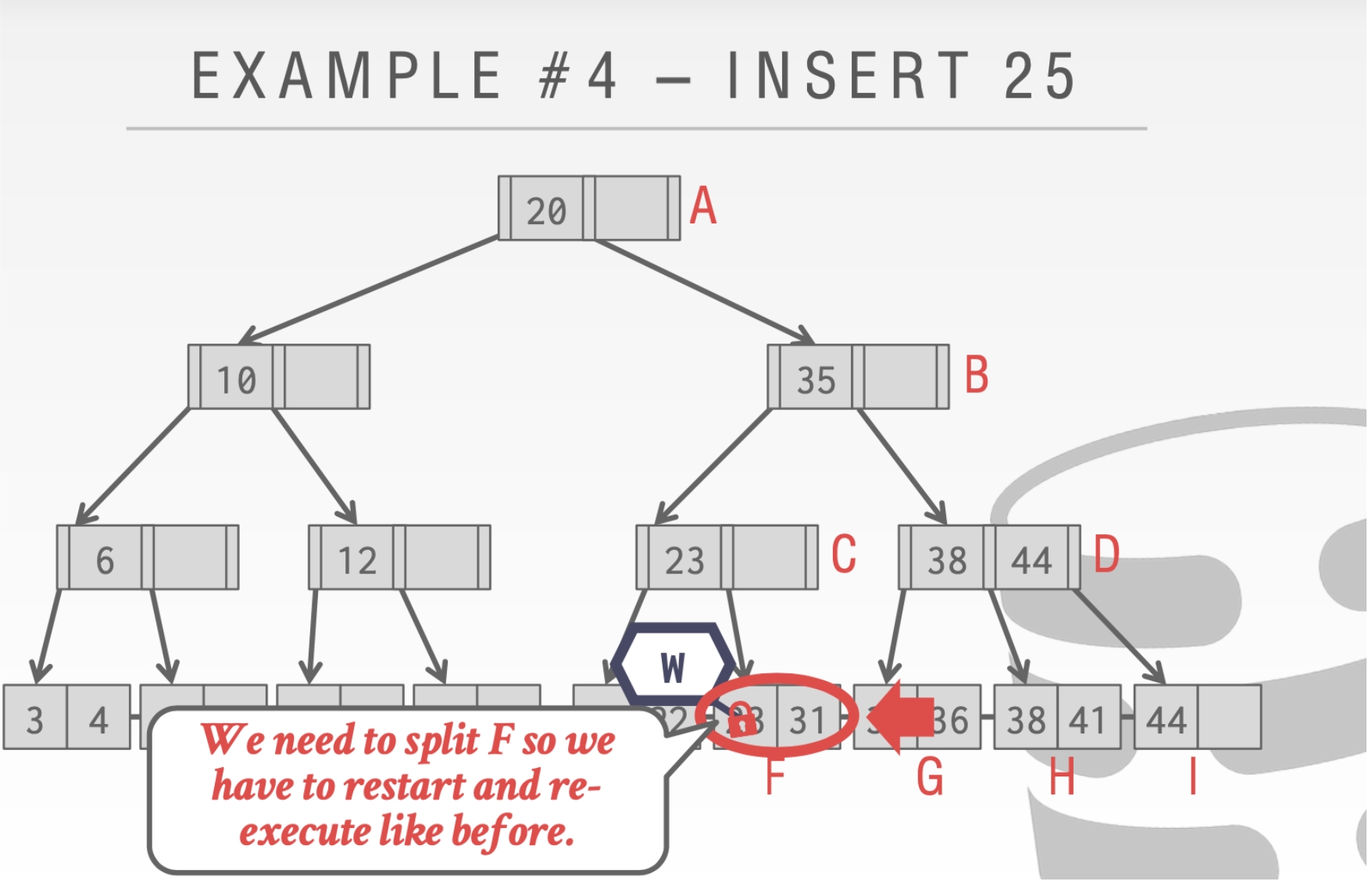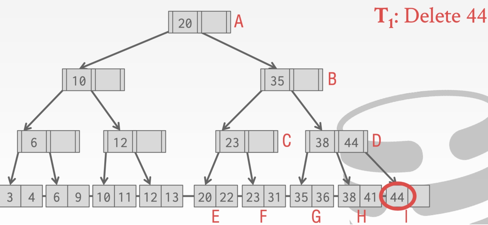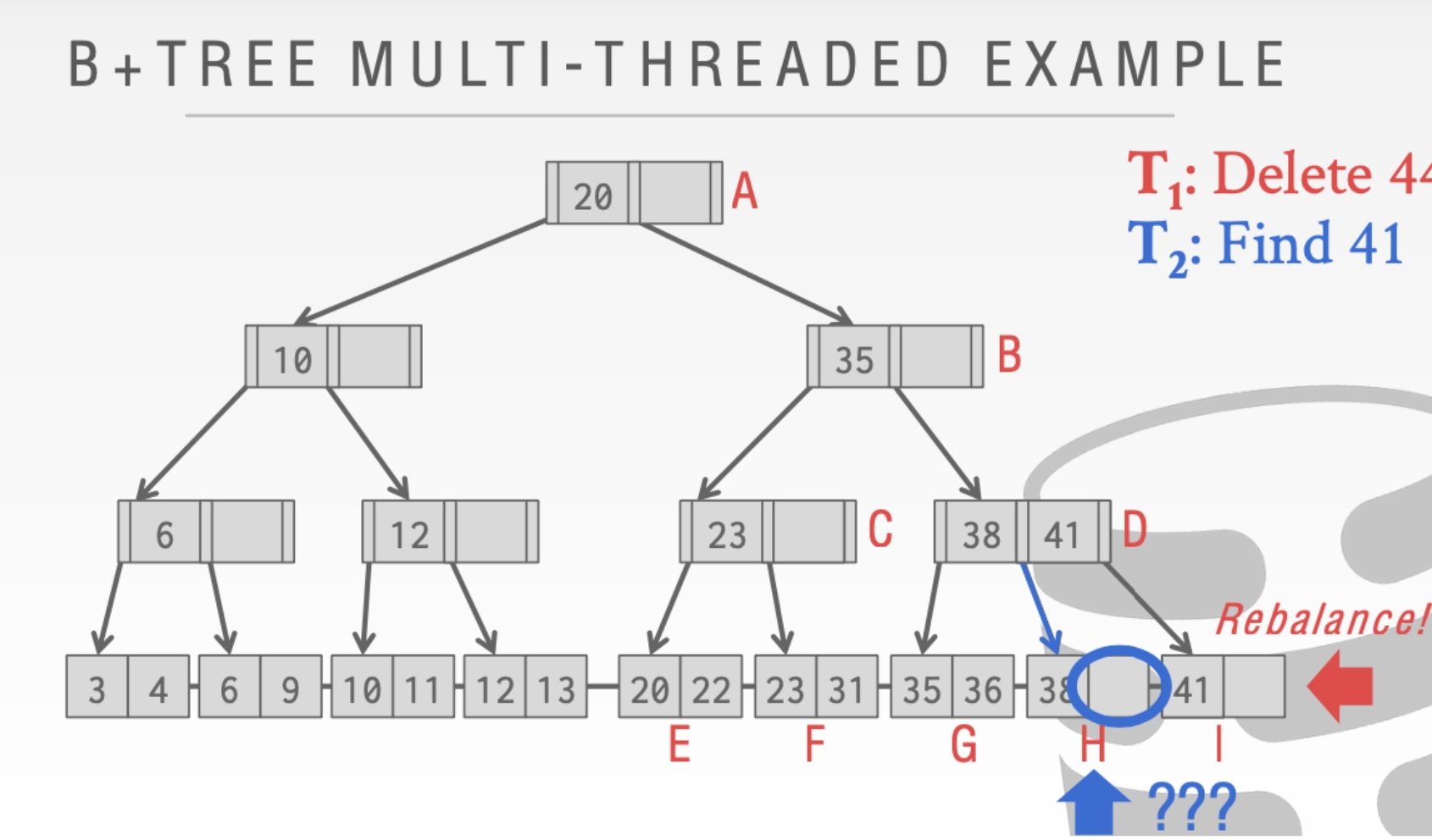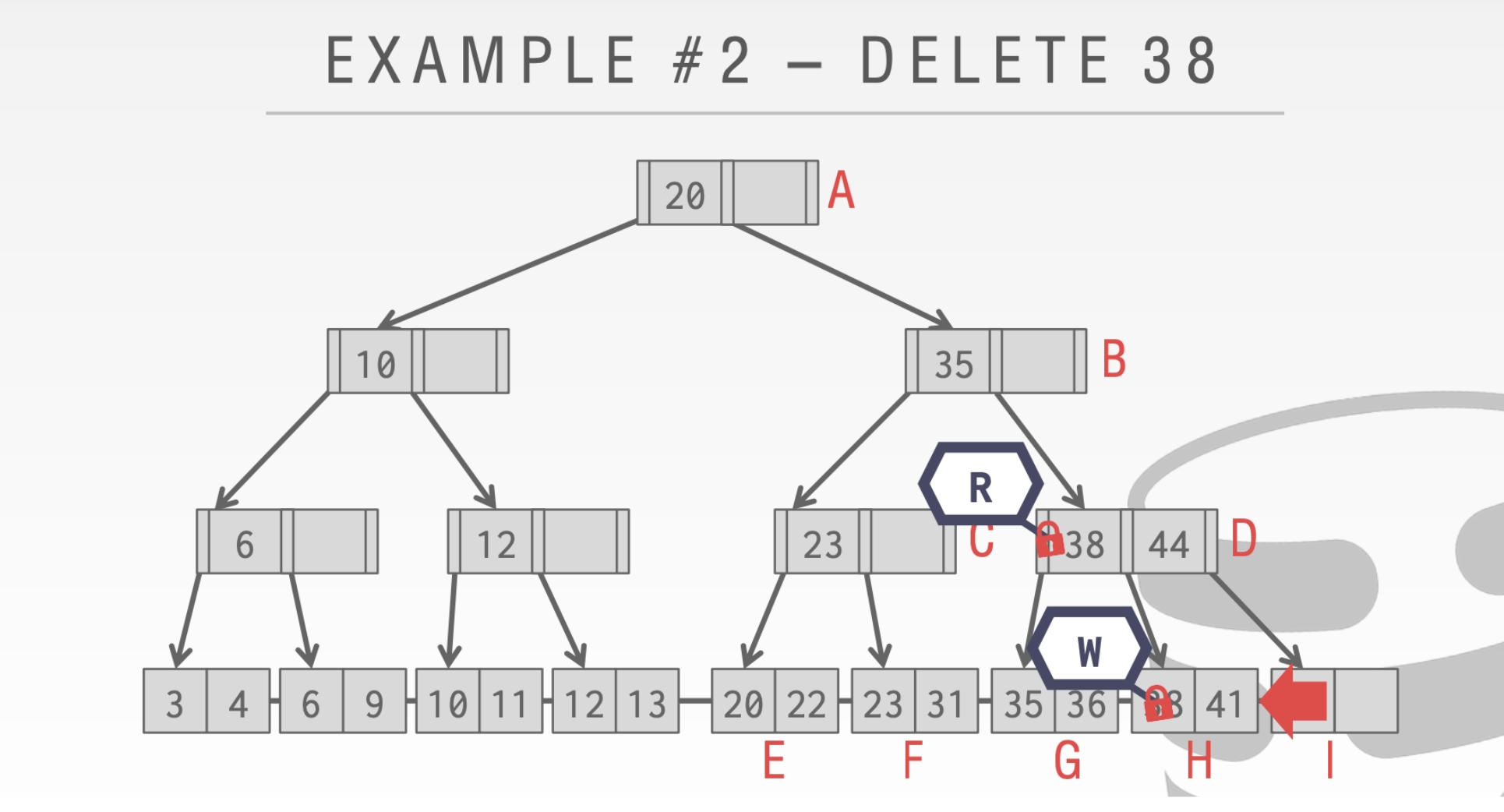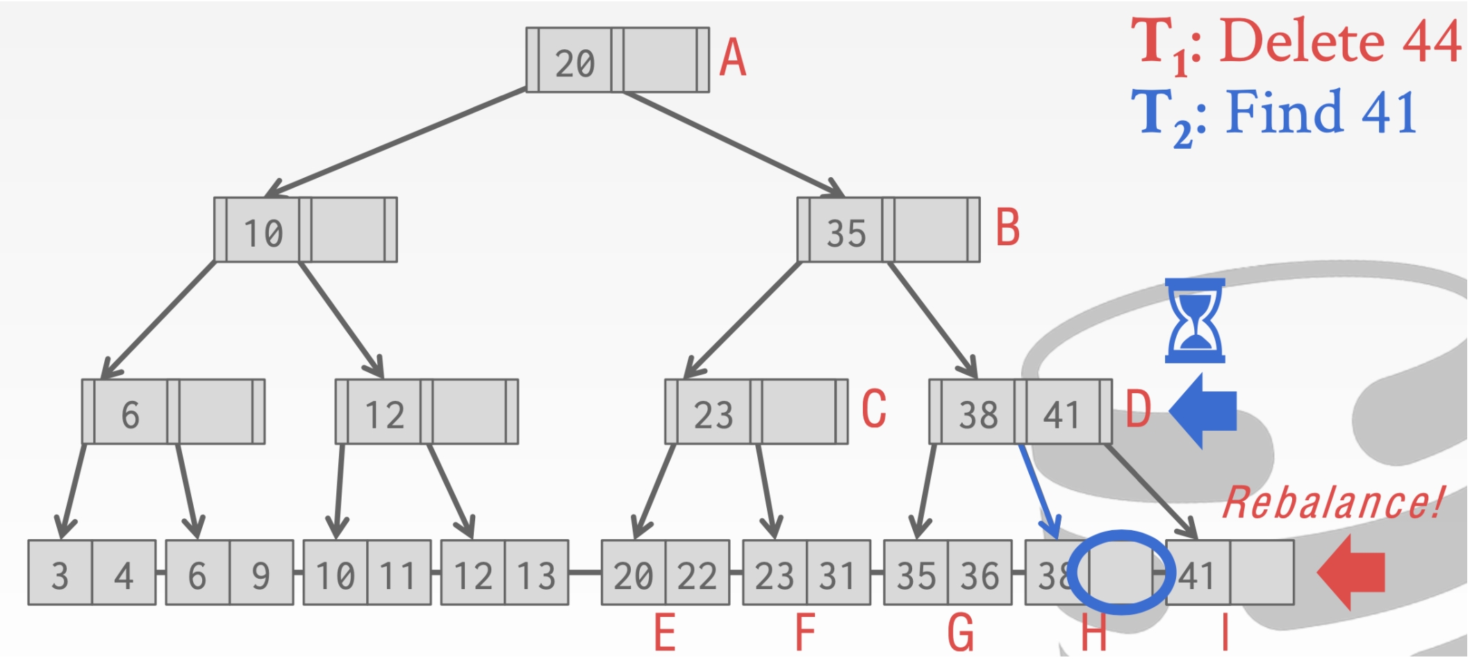 这里我们不能释放结点A的Latch。因为我们的删除操作可能会合并根节点。
