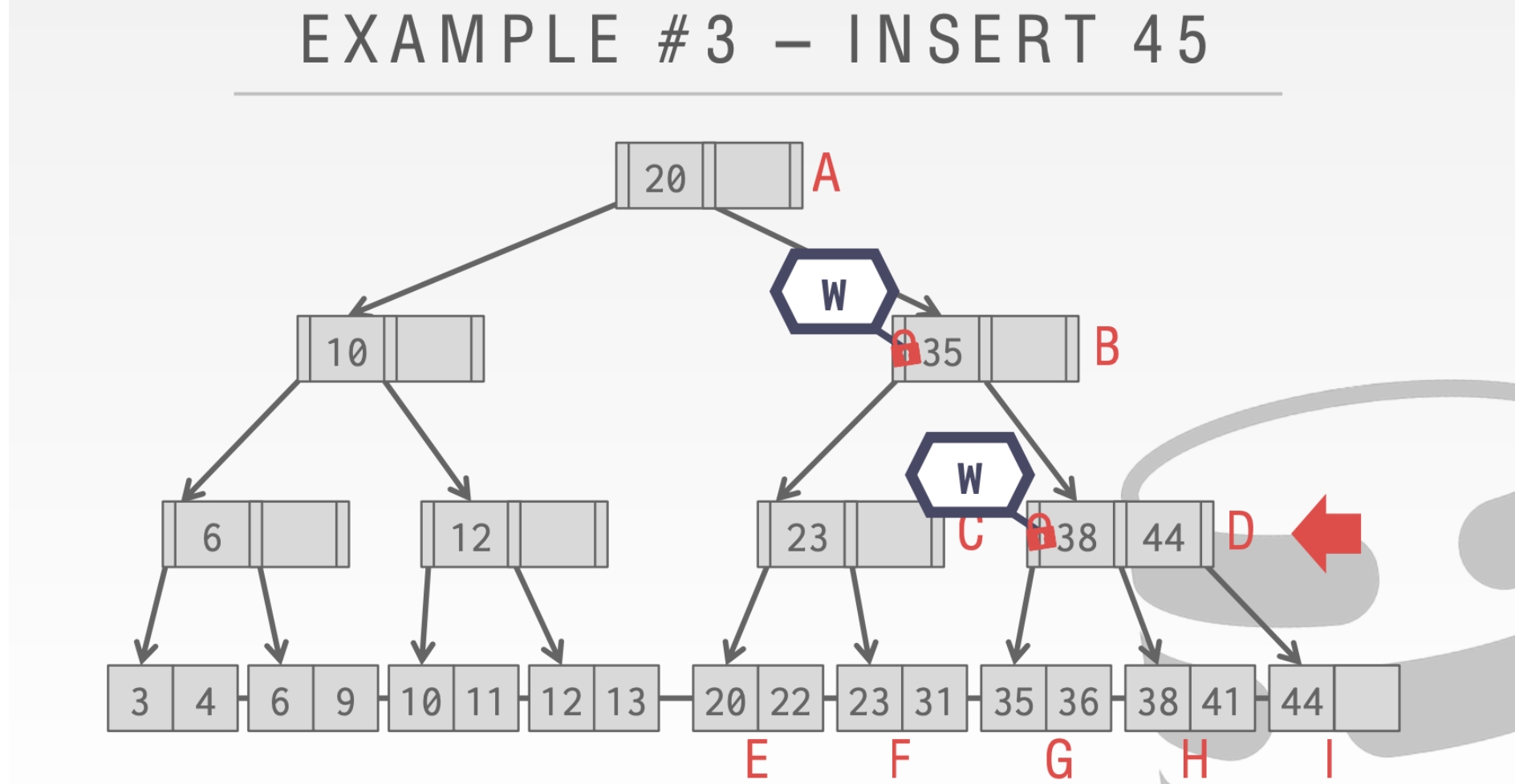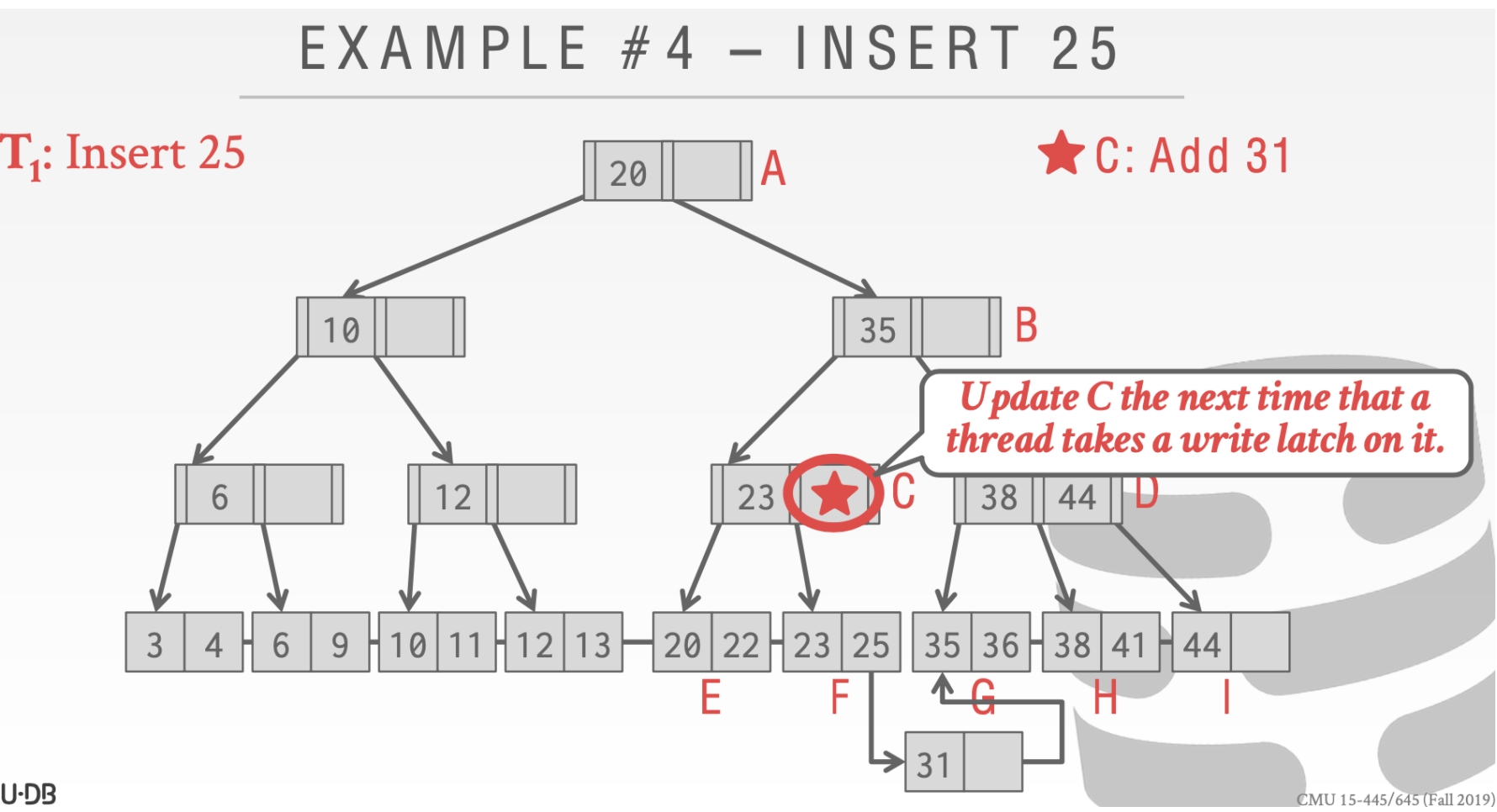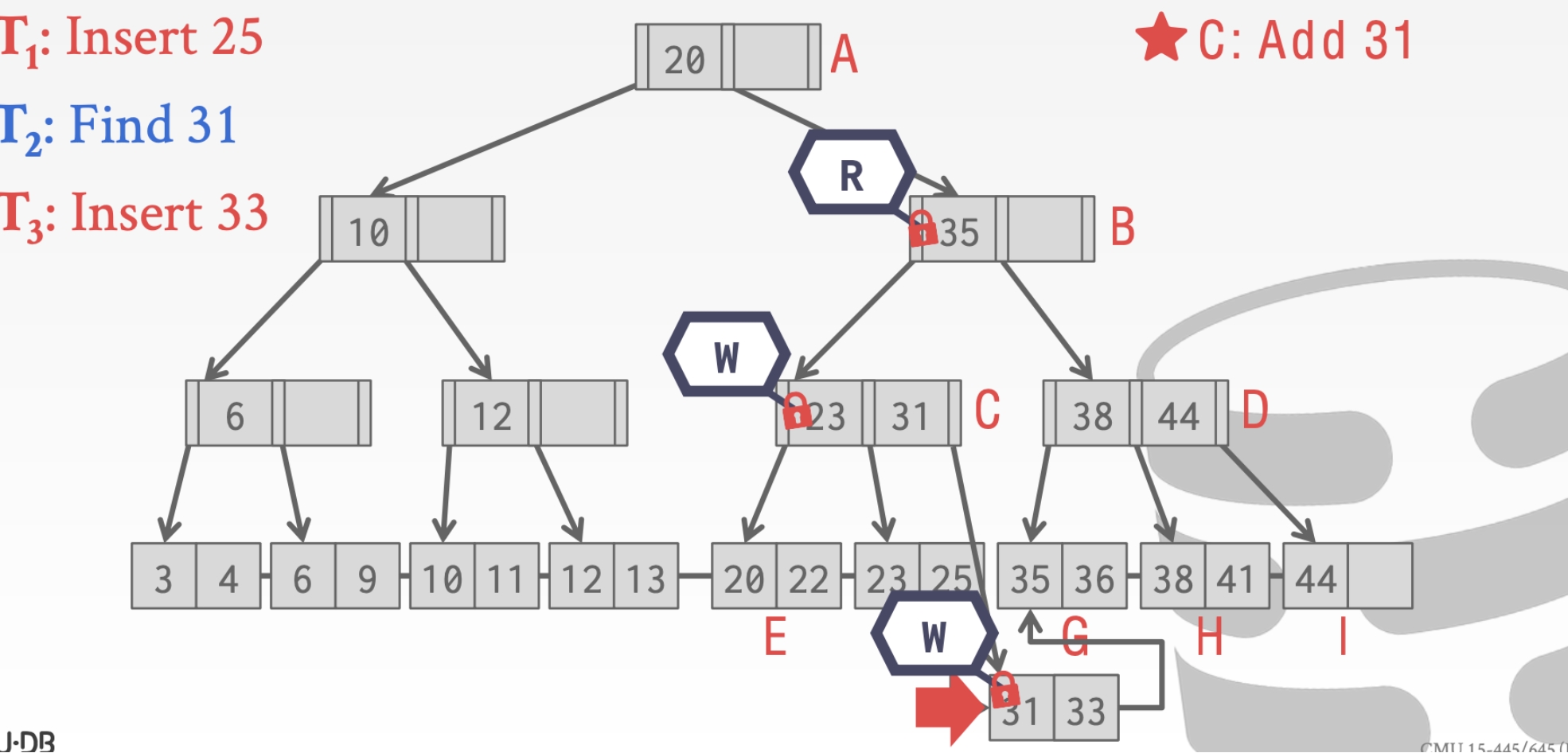 当执行到结点C的时候。因为这个时候有另一个线程持有了write Latch。所以这个时候🌟操作要执行。随后在插入33