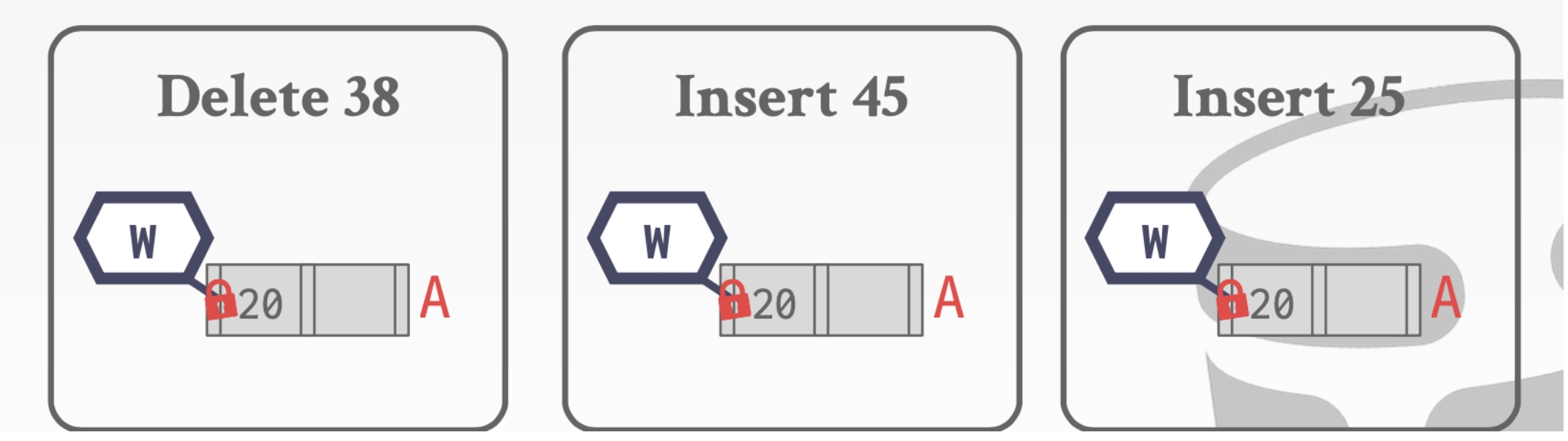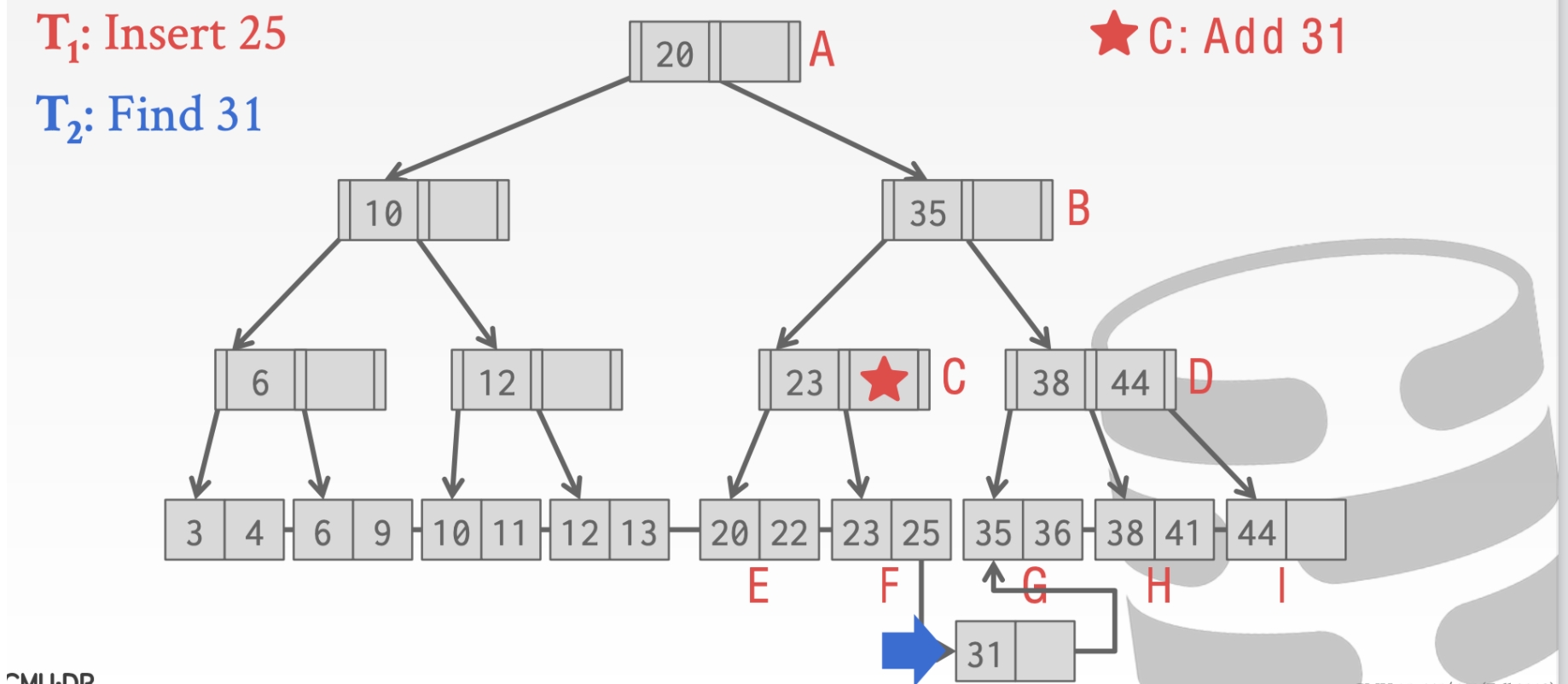 乐观的假设大部分操作是不需要进行合并和分裂的。因此在我们向下的时候都是读Latch而不是写Latch。只有在叶子结点才是write Latch
