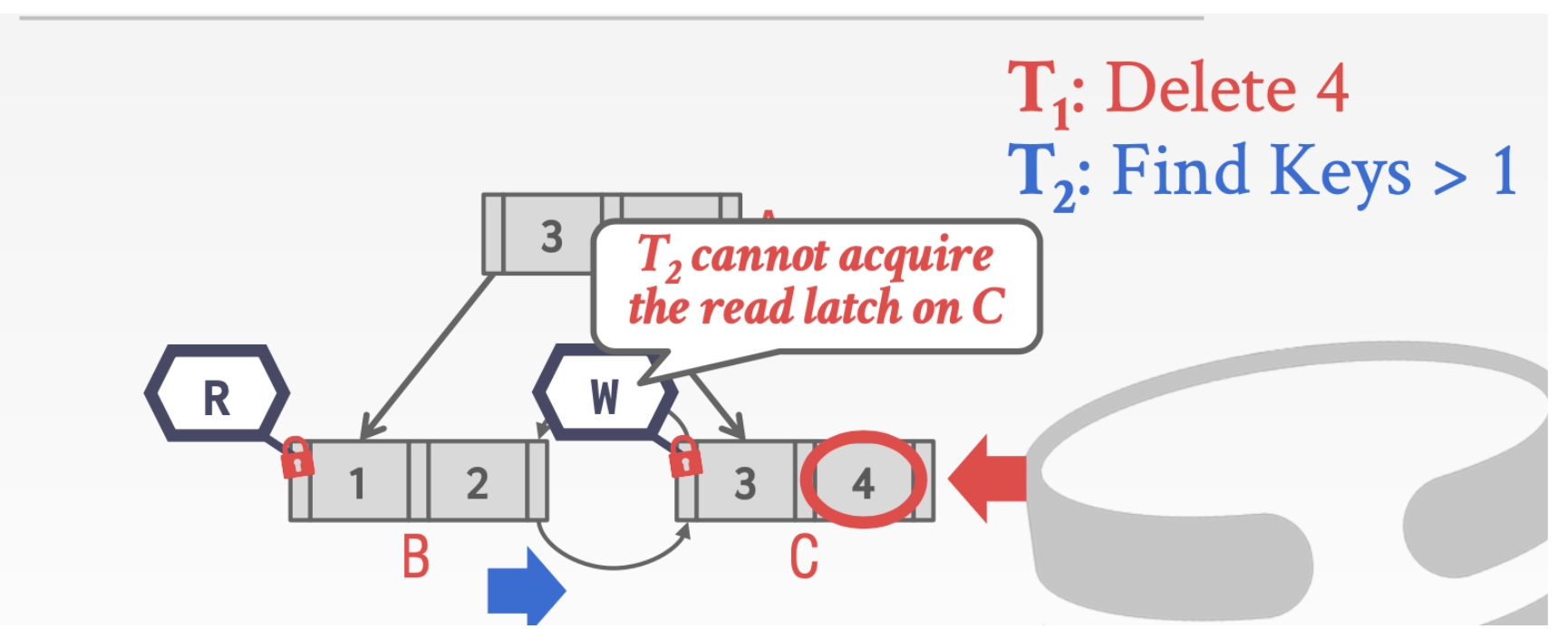 这时候会发生问题,因为线程2无法拿到read Latch