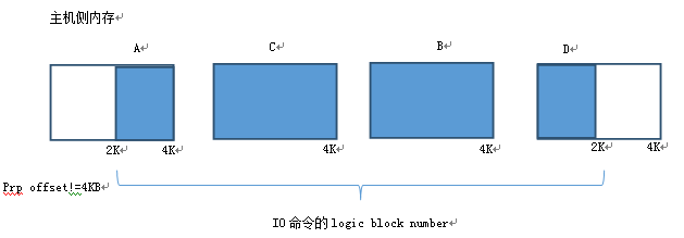 数据在主机侧的内存中,一般以4KB为单位颗粒存放,但颗粒之间物理地址并不连续,而且起始颗粒的offset并不是4KB对齐的。如下图