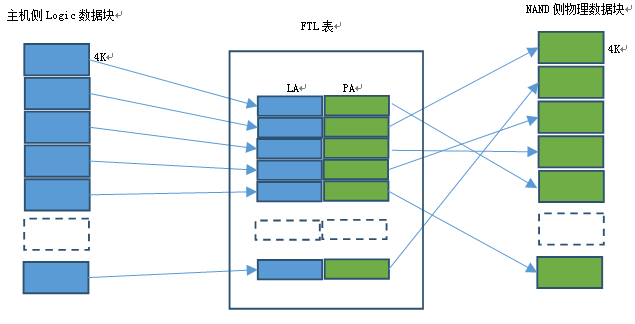 因为每个IO命令的数据传输大小从512B 到256MB不等,对于SSD中央控制器(FTL管理模块)来说,管理的NAND测数据单元一般是4KB。
