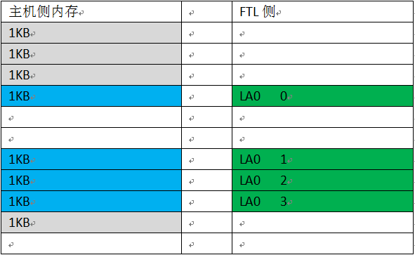 从上面两张图可以看出,数据块在主机侧内存是否4KB对齐,SLBA是否4KB对齐,Logic Block Number是否是4KB的倍数,会组成很多复杂的情况。比如:数据块主机侧内存4KB不对齐,那么FTL侧看到的4KB在主机侧内存会分布在两个主机侧内存块里。