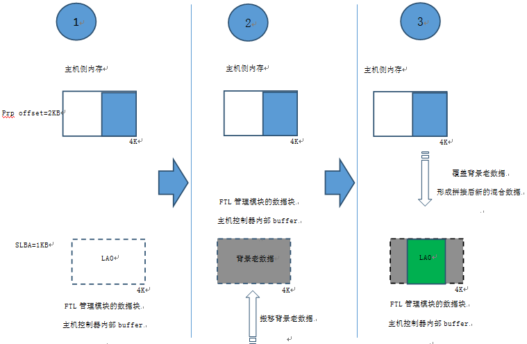 如果分解后的IO数据块小于4KB(如:512B,1KB,1.5KB,2KB… ….),对写IO数据,则涉及到不完整部分数据和FTL 4KB数据块中其他原有背景数据拼接的问题。
