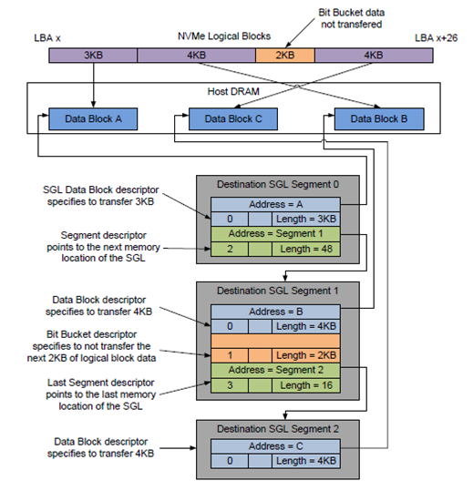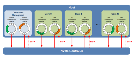 NVMe采用了多命令队列 (最大65536个命令队列),每个命令可变数据长度(512B到2MB),同时数据在host端内存支持Physical Region Page和Scatter Gather List。