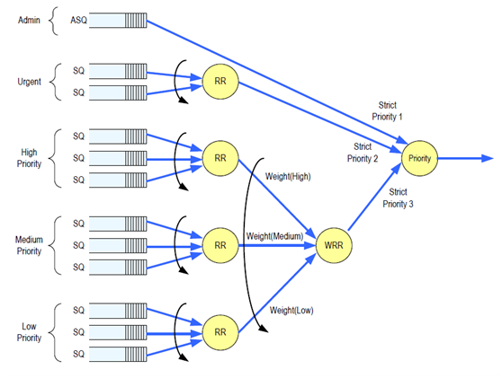 NVMe协议支持命令间的乱序执行,也支持命令内数据块的乱序传输,同时支持命令队列间的可变权重处理。