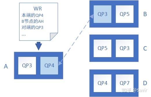 上述过程如下图所示,A节点收到用户的这样一个任务——使用本端的QP4与B节点(通过AH指定)的QP3进行数据交换: