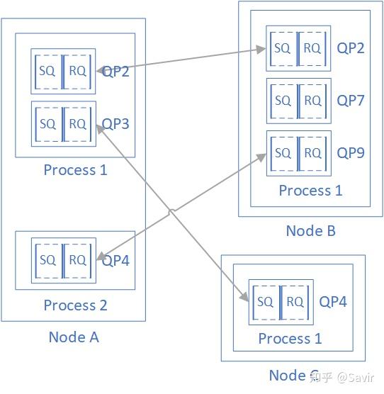 需要注意的是,在RDMA技术中通信的基本单元是QP,而不是节点。如下图所示,对于每个节点来说,每个进程都可以使用若干个QP,而每个本地QP可以“关联”一个远端的QP。我们用“节点A给节点B发送数据”并不足以完整的描述一次RDMA通信,而应该是类似于“节点A上的QP3给节点C上的QP4发送数据”。