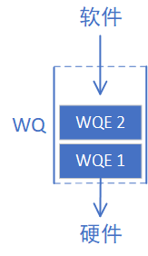WQE的含义应该比较明确了,那么我们最开始提到的WQ是什么呢?它就是用来存放“任务书”的“文件夹”,WQ里面可以容纳很多WQE。有数据结构基础的读者应该都了解,队列是一种先进先出的数据结构,在计算机系统中非常常见,我们可以用下图表示上文中描述的WQ和WQE的关系: