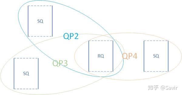 Shared Receive Queue简称SRQ,意为共享接收队列。概念很好理解,就是一种几个QP共享同一个RQ时,我们称其为SRQ。以后我们会了解到,使用RQ的情况要远远小于使用SQ,而每个队列都是要消耗内存资源的。当我们需要使用大量的QP时,可以通过SRQ来节省内存。如下图所示,QP2~QP4一起使用同一个RQ: