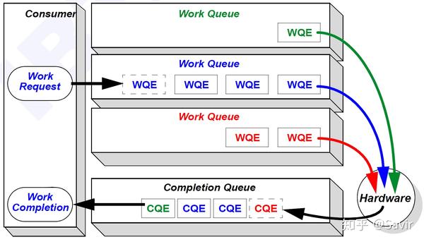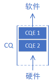 而CQ就是承载CQE的容器——一个先进先出的队列。我们把表示WQ和WQE关系的图倒过来画,就得到了CQ和CQE的关系: