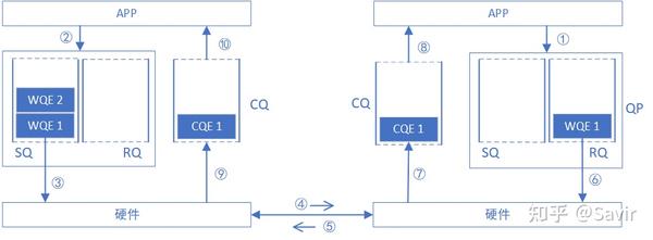 下面我们把CQ和WQ(QP)放在一起,看一下一次SEND-RECV操作中,软硬件的互动(图中序号顺序不表示实际时序):
