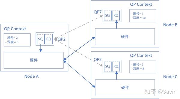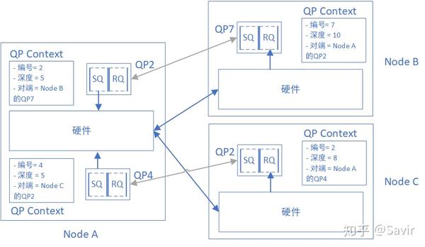“连接”是如何维护的呢?其实就是在QPC里面的一个记录而已。如果A的QP2想断开与B的QP7的“连接”然后与其他QP相“连接”,只需要修改QPC就可以了。两个节点在建立连接的过程中,会交换稍后用于数据交互的QP Number,然后分别记录在QPC中。