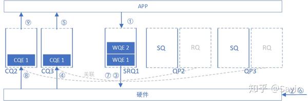 而SRQ通过允许很多QP共享接收WQE(以及用于存放数据的内存空间)来解决了上面的问题。当任何一个QP收到消息后,硬件会从SRQ中取出一个WQE,根据其内容存放接收到的数据,然后硬件通过Completion Queue来返回接收任务的完成信息给对应的上层用户。