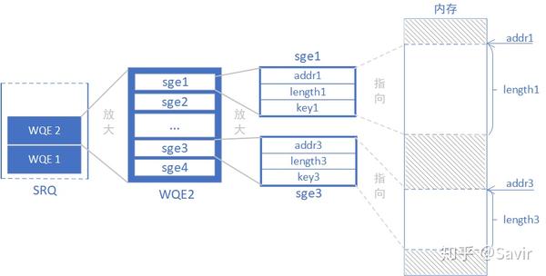 上图中的SRQ中有两个RQ WQE,我们看一下RQ WQE的内容,它们是由数个sge(Scatter/Gather Element)组成的,每个sge由一个内存地址,长度和秘钥组成。有了起始地址和长度,sge就可以指向一块连续的内存区域,那么多个sge就可以表示多个彼此离散的连续内存块,我们称多个sge为sgl(Scatter/Gather List)。sge在IB软件协议栈中随处可见(其实在整个Linux都很常见),可以用非常少的空间表示非常大的内存区域,IB的用户都使用sge来指定发送和接收区域的。