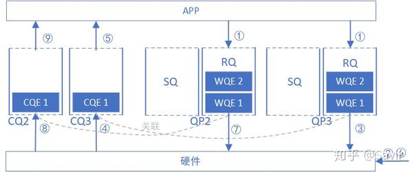细心地读者可能会问,用户下发WR时,每个WR都指定了一些未来用来存放数据的内存区域。但是SRQ是一个池子,里面每个WQE都指向了不同的若干段内存区域。用户收到某个QP对应的CQ中的WC后如何知道接收到的数据存放到哪里了呢? WC中其实有wr_id信息,告知用户数据放到哪个WR(WQE)指定的内存区域了,既然WR是用户下发的,用户自然知道其指向的具体位置。