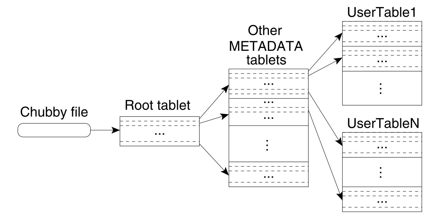 Bigtable 的 Tablet 之间会形成一个三层结构,类似B+树,具体如下:
