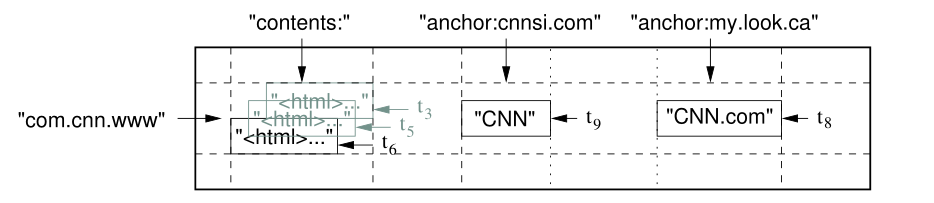 存储网页的示例表的一部分。行名称是反向 URL。内容列族包含页面内容,锚列族包含引用页面的任何锚的文本。 CNN 的主页被 Sports Illustrated 和MY-look主页引用,因此该行包含名为 anchor:cnnsi.com 和 anchor:my.look.ca 的列。每个锚单元都有一个版本;内容列有三个版本,时间戳为 t3、t5 和 t6。