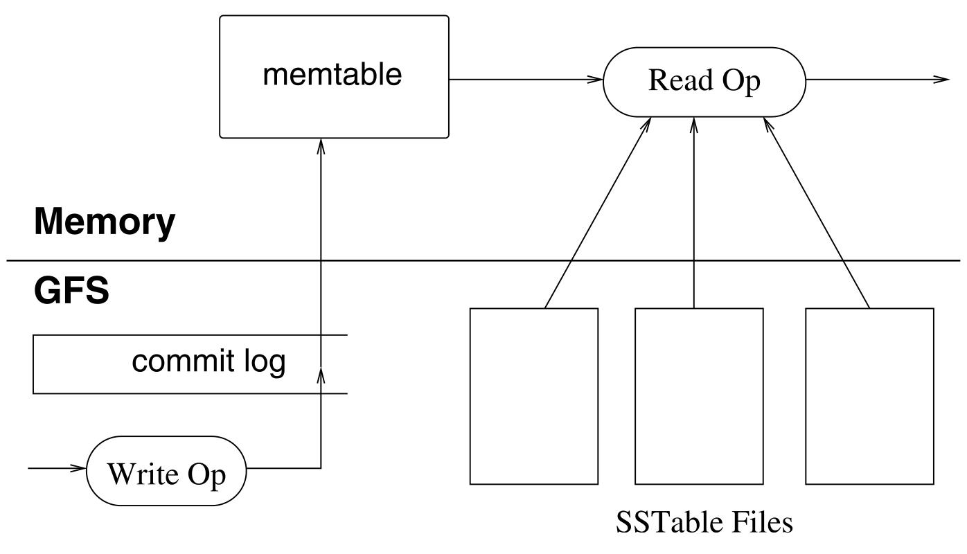 可见,一个 Tablet 由若干个位于 GFS 上的 SSTable 文件、一个位于内存内的 MemTable 以及一份 Commit Log 组成。