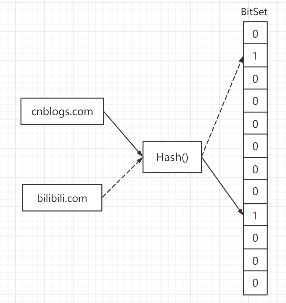 每个map值都使用1bit,这样大大降低了内存开销,具体做法是,我们使用一个Hash函数将URL映射到大小为n的bit数组中,并置相应位置为True