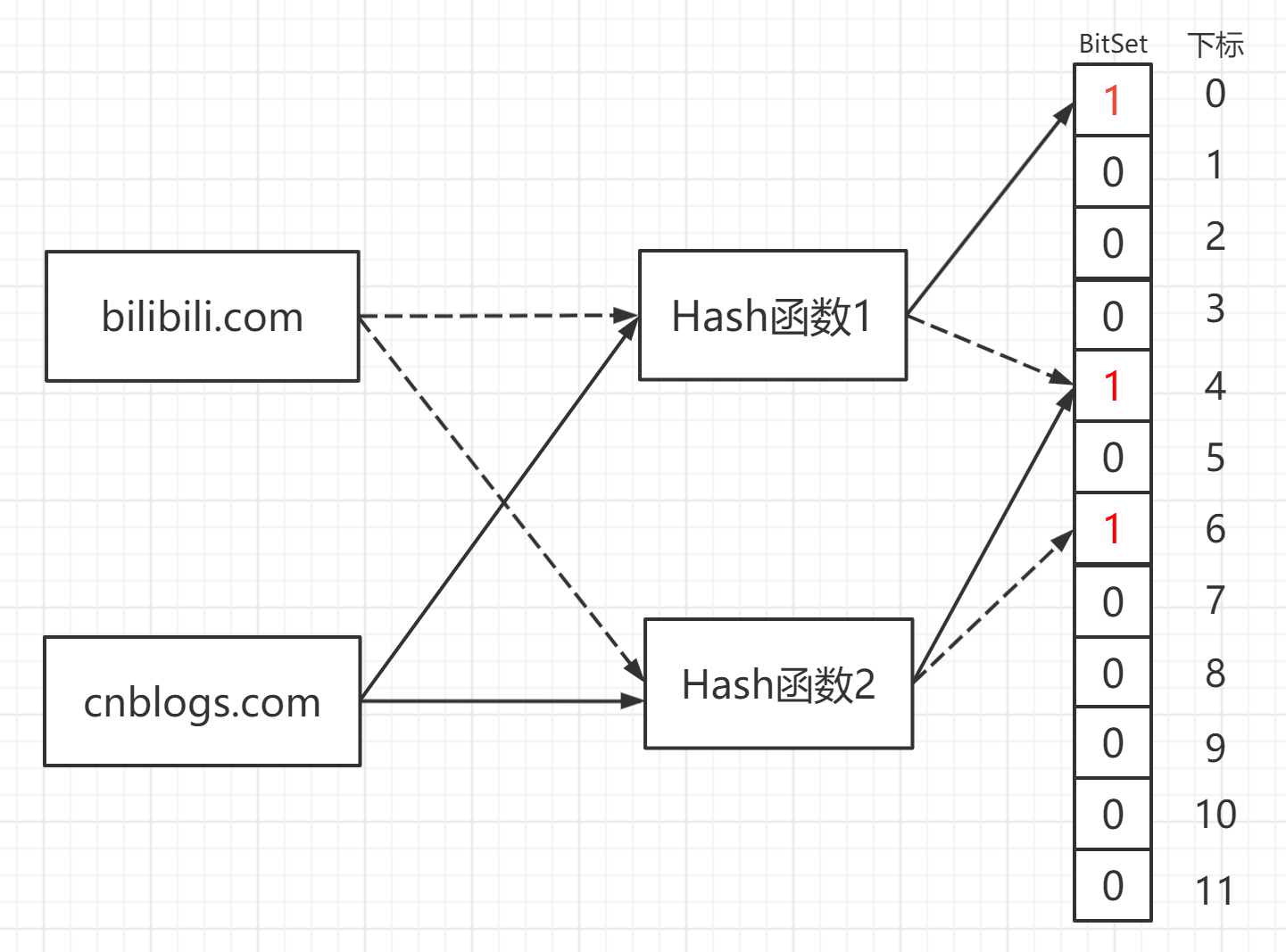 使用多个Hash函数对数据进行哈希操作(如下图使用了两个hash函数),这样得出多个位置为True,相比位图它在有限的空间内,尽可能的降低了查询失败的可能,这一点可以从信息熵的角度来看,每一个位置所包含的信息更加多了,所以比起位图来说,布隆过滤器对空间的利用率也变大了