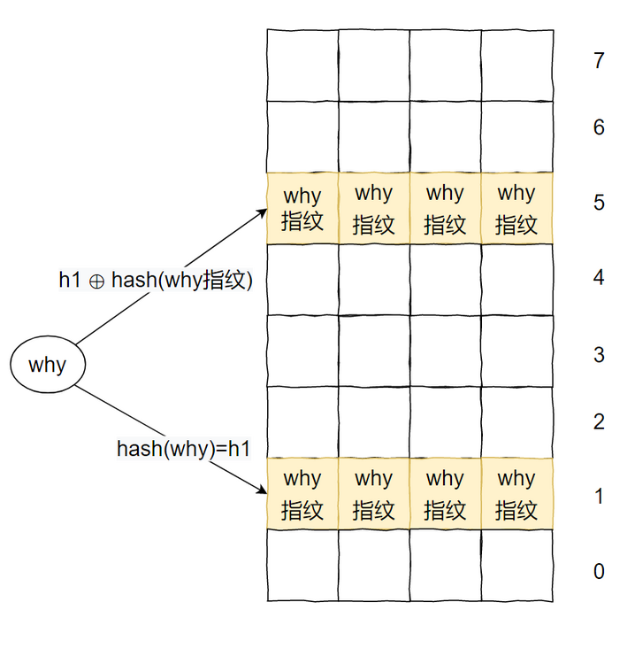 i2 = h2(x) = i1 ⊕ hash(f) 使用第一个索引和指纹的哈希做了一个异或操作