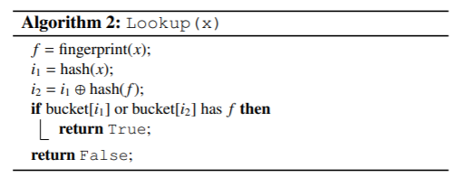 给定一个项x,算法首先根据上述插入公式,计算x的指纹和两个候选桶。然后读取这两个桶:如果两个桶中的任何现有指纹匹配,则布谷鸟过滤器返回true,否则过滤器返回false。此时,只要不发生桶溢出,就可以确保没有假阴性